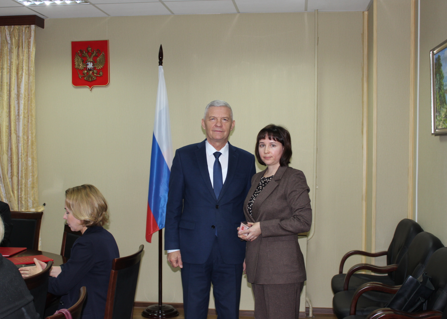 18 декабря 2024 г. перед заседанием Квалификационной коллегии судей Владимирской области в торжественной обстановке главный федеральный инспектор по Владимирской области Сергей Станиславович Мамеев вручил служебные удостоверения судьям, назначенным на должности Указом Президента Российской Федерации № 981 от 14 ноября 2024 года: - Барченковой Елене Владимировне – председателю Александровского городского суда Владимирской области, - Овчинниковой Екатерине Евгеньевне – председателю Гусь-Хрустального городского суда Владимирской области, - Прокофьевой Екатерине Владимировне – судье Владимирского областного суда, - Мелиховой Алене Александровне – судье Октябрьского районного суда г.Владимира, - Яковлевой Ольге Александровне – судье Ковровского городского суда Владимирской области. Сергей Станиславович поздравил судей с назначением и пожелал им качественной и эффективной работы по отправлению правосудия. Также поздравил судейское сообщество с наступающим Новым годом, поблагодарил за плодотворную работу в уходящем году и пожелал дальнейших профессиональных успехов и достижений. ![]() |