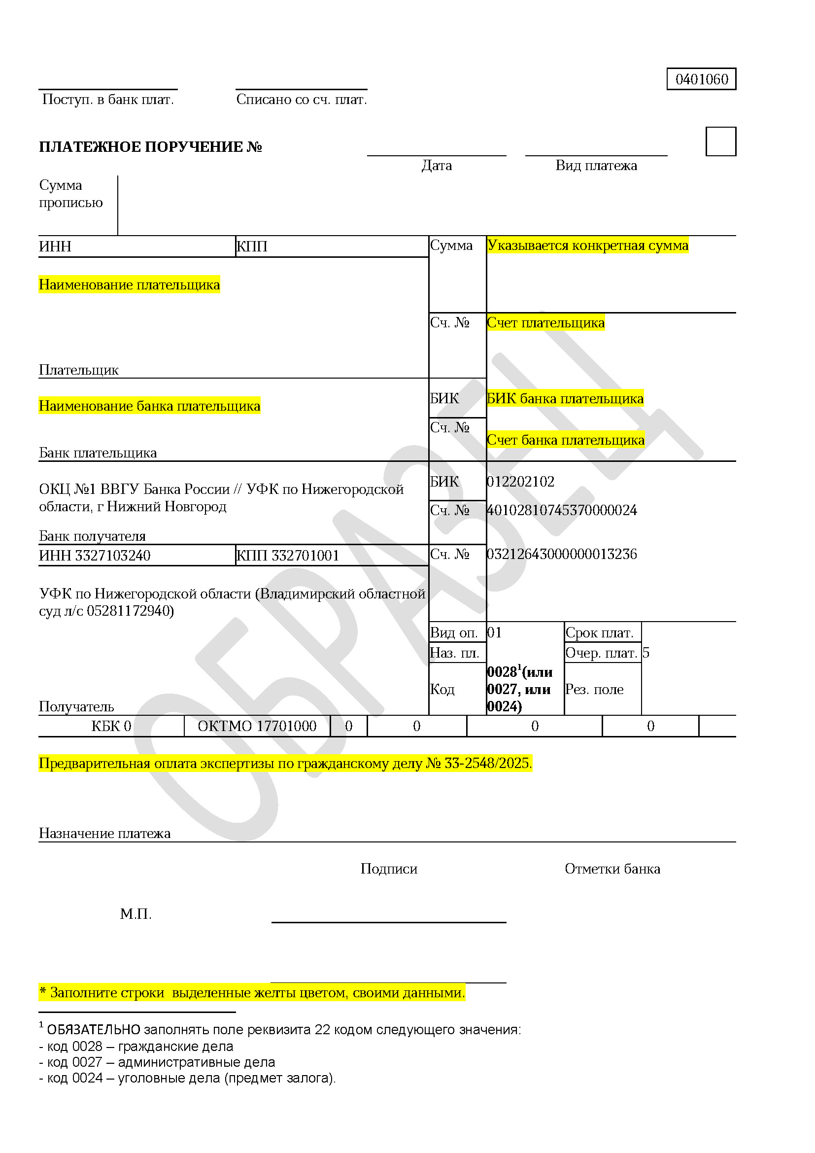 Получатель: УФК по Нижегородской области (Владимирский областной суд л/с 05281172940)
